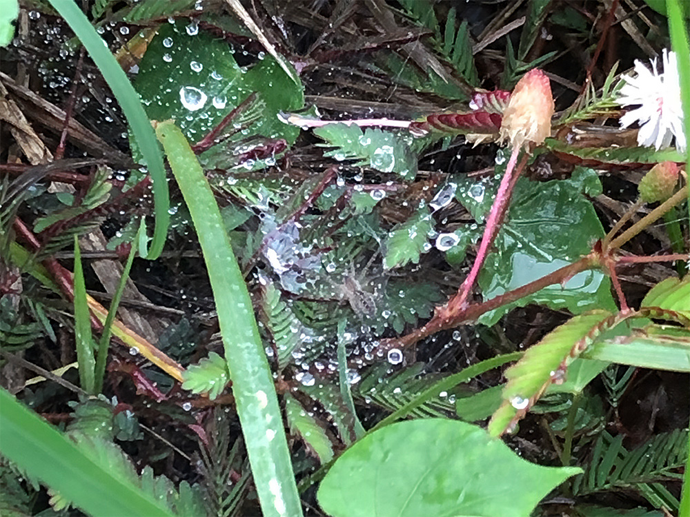 オジギソウがいっぱい生えていて、ぬかるんでいるところもあります。 イネ科の植物が太ももまで伸びていました。