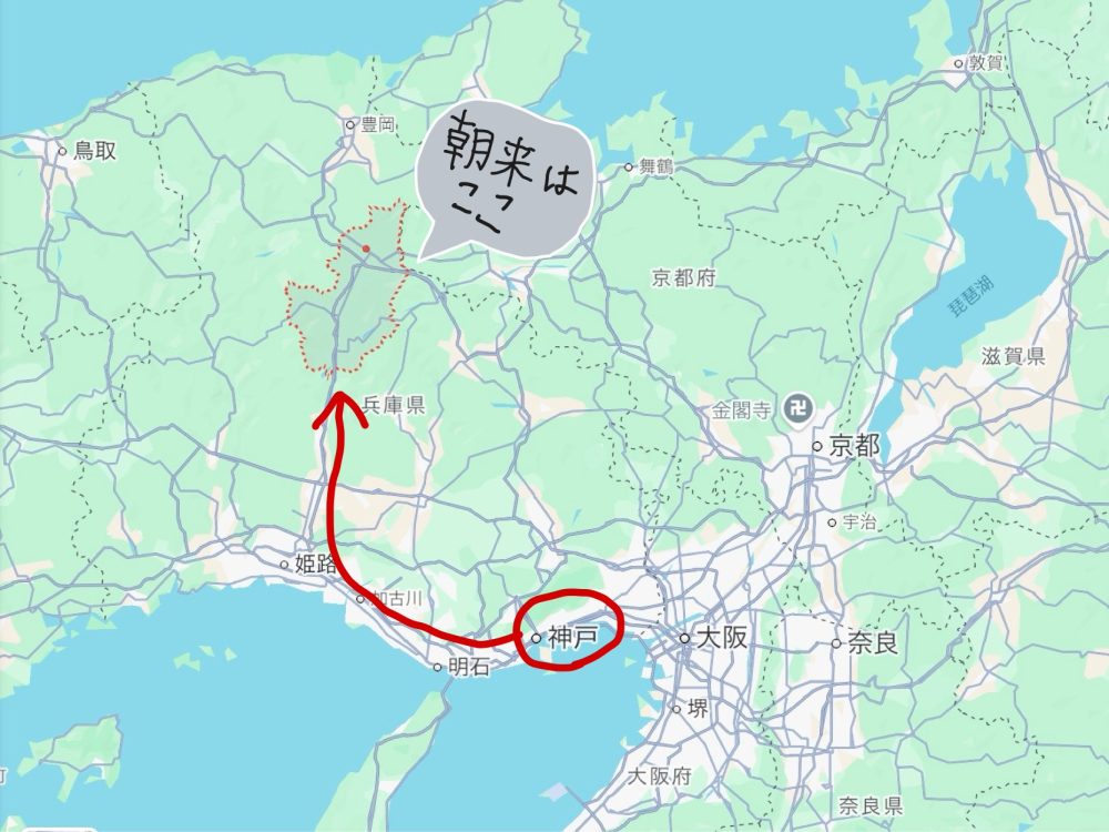 神戸のホテルから、迎えにきたお父さんの車で出発して兵庫県の朝来(あさご)市に向かいます。
