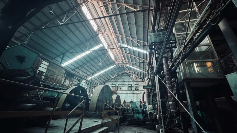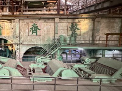 工場の中には色々な機械で埋め尽くされていました。機械の隙間を通るような通路を進んでいきます。中は昔そのままでガラスの破片や新聞などが落ちており、廃墟のようになっていて、映画やゲームの世界のようです。実際に映画なのか?衣装を着て撮影している人たちがいました。